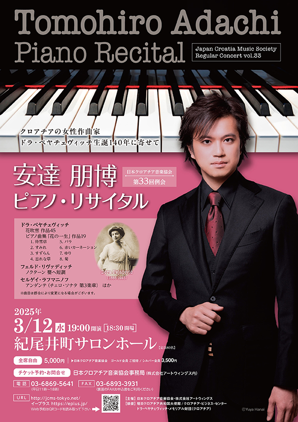 国際的に活躍する安達朋博によるドラ・ペヤチェヴィッチ生誕140年記念公演。