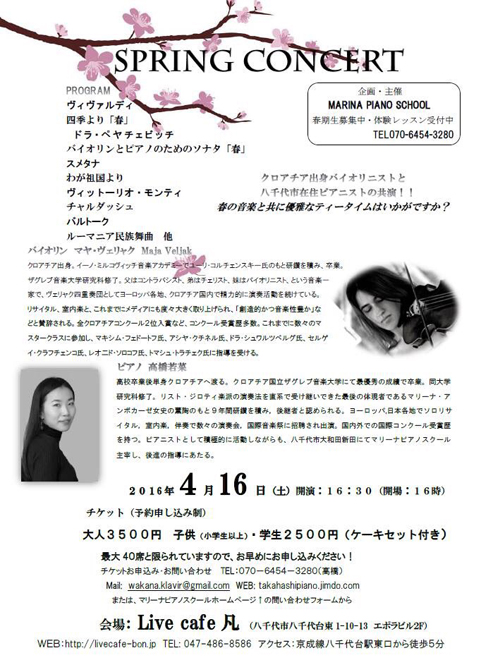 TEL 070-6454-3280 (コンサート運営事務局直通)本国で活躍中のクロアチア人ヴァイオリニスト マヤ・ヴェリャクさんとクロアチアで研鑽を積まれたピアニスト高橋若菜さんによる日本でのスペシャルコンサートです。当公演ではクロアチア初の女性作曲家ドラ・ペヤチェヴィッチのヴァイオリンとピアノのためのソナタもご披露されます。お見逃しなく!