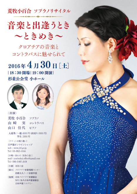 TEL 03-3821-5166 (日声協オンラインショップ電話窓口)昨年クロアチアでも公演をなさったソプラノ荒牧小百合さんによるリサイタルです。当公演ではクロアチア人作曲家、ドラ・ペヤチェヴィッチ、フラゴイェ・ベルサ、ボジダル・クンツの歌曲もご披露されます。ベルサの歌曲につきましては本邦初演となりますので、ぜひこの機会にお聴き下さい!