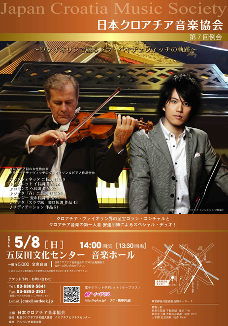 TEL 03-6869-5641 (日本クロアチア音楽協会)クロアチアのヴァイオリン界の至宝ゴラン・コンチャル氏とクロアチア音楽の第一人者ピアニスト安達朋博とのスペシャルデュオ。クロアチア初の女性作曲家ドラ・ペヤチェヴィッチのヴァイオリンとピアノのための作品を全曲一挙再現!日本初の試み、必聴公演です!今後クロアチア本国でもデュオリサイタルが予定されています。