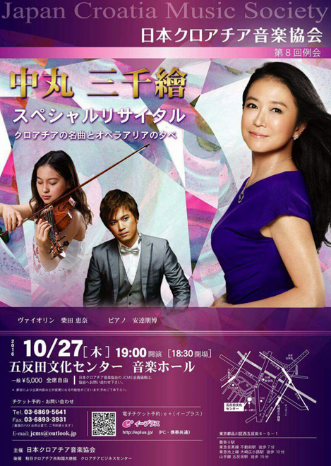 TEL 03-6869-5641 (日本クロアチア音楽協会)マリア・カラス・コンクールで唯一の日本人優勝者である世界的オペラ歌手中丸三千繪さんによる、クロアチア初の女性作曲家ドラ・ペヤチェヴィッチとクロアチアの近代作曲家ボジダル・クンツの歌曲と、イタリア・オペラアリアの名曲の夕べ。ヴァイオリンには期待の星 桐朋学園大学3年生の柴田恵奈さんが共演致します。お聴き逃しなく!