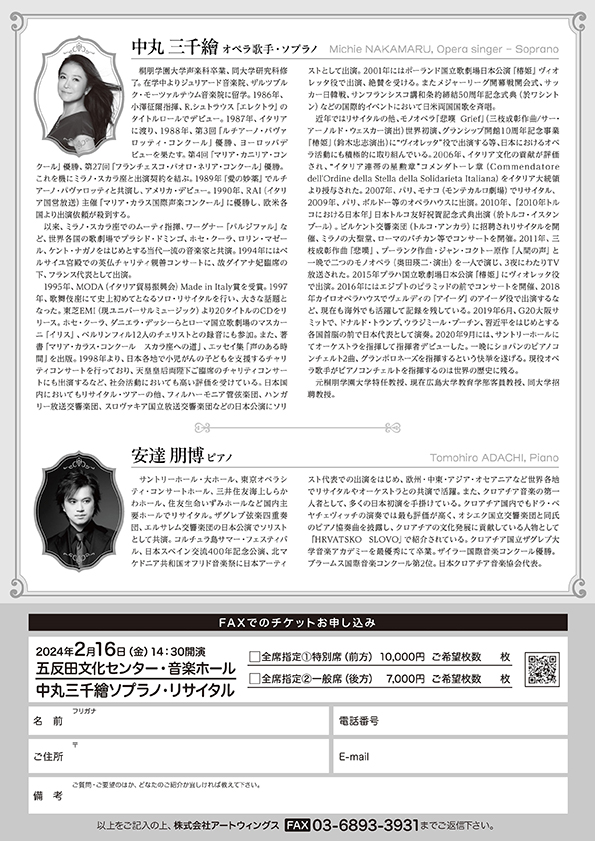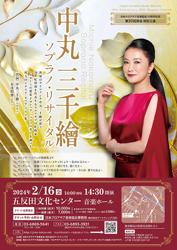 WEB予約はこちらから日本クロアチア音楽協会 10周年記念特別公演! マリア・カラス・コンクールにて優勝後、世界各国のオペラハウスに出演するオペラ歌手 世界のプリマドンナ中丸三千繪による圧倒的なステージ! クロアチア歌曲とイタリア・オペラ・アリア集の素敵なひととき。